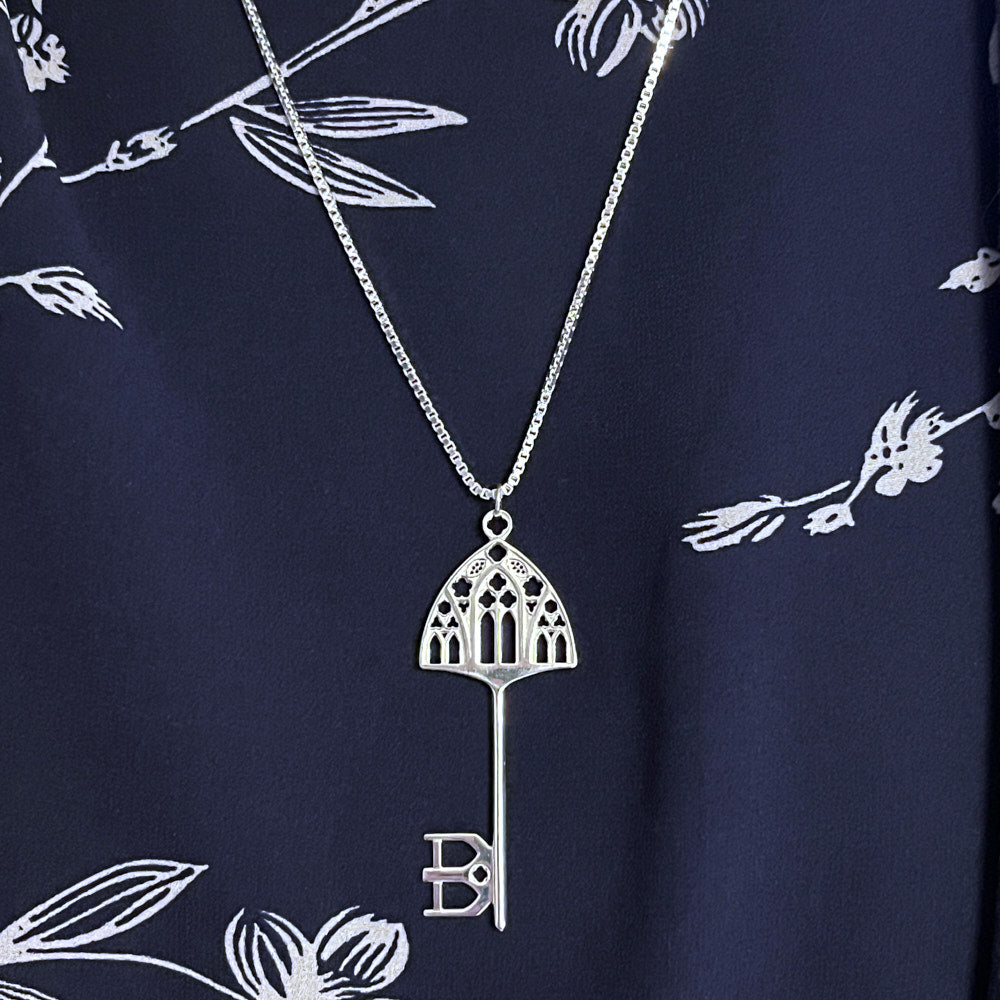 Unit price perA sterling silver homage to the beauty and intricacy of Gothic cathedrals, our Gothic Key Necklace has both bow and wards designed to resemble glorious Gothic windows and arches. Pointed arches, mullions, and tracery all combine in this truly unique pendant. Suspended from a 22 inch sterling silver 1.5mm Italian box chain, this piece is classic enough for any occasion.